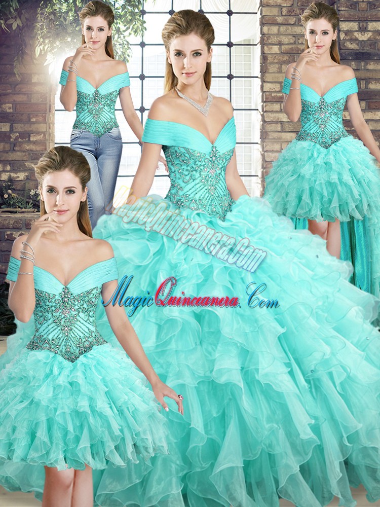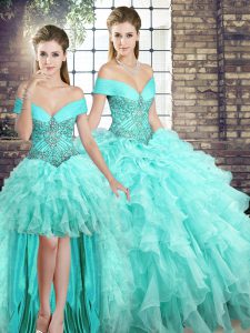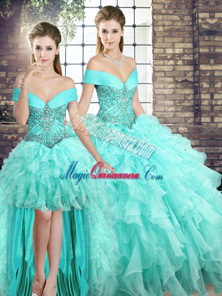 Low Price Off The Shoulder Sleeveless Quinceanera Gowns Brush Train Beading and Ruffles Aqua Blue Organza