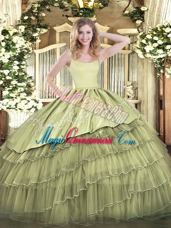 Low Price Olive Green Sweet 16 Dresses Military Ball and Sweet 16 and Quinceanera with Embroidery and Ruffled Layers Straps Sleeveless Zipper