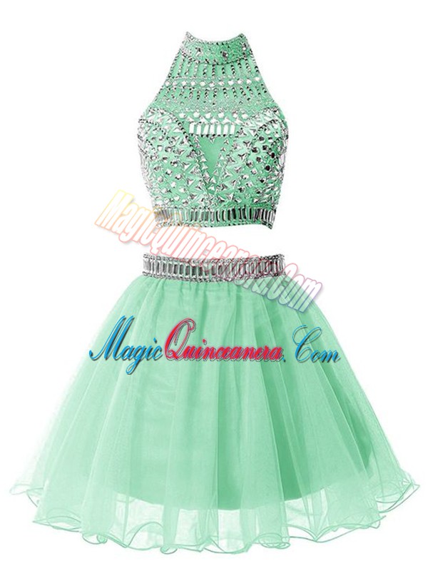 Luxurious Apple Green A-line High-neck Sleeveless Organza Knee Length Zipper Beading Damas Dress