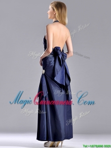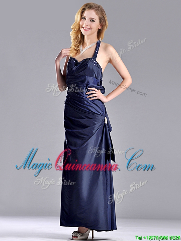Luxurious Beaded Decorated Halter Top Dama Dress in Navy Blue