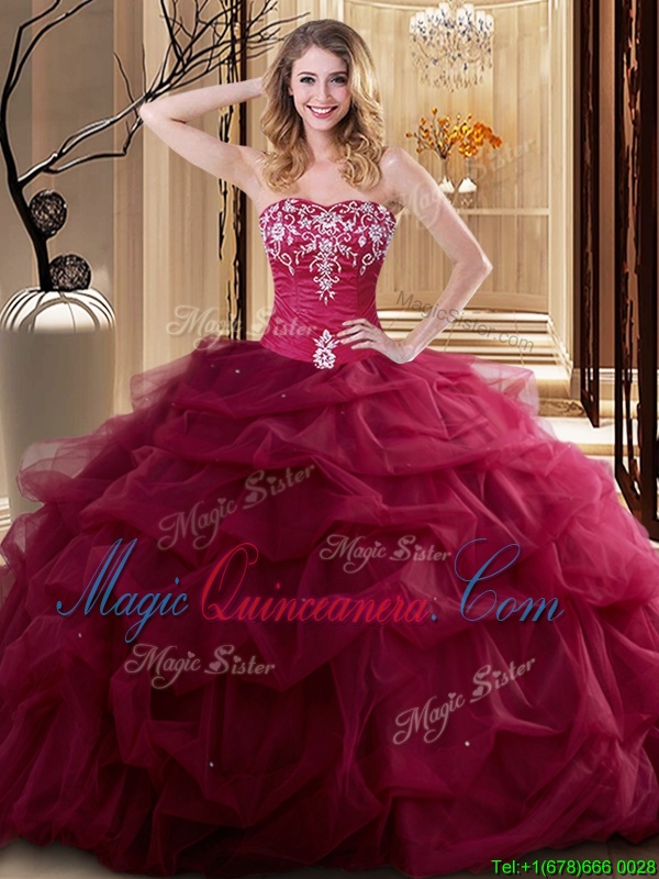 Luxurious Embroidery and Ruffles 15 Quinceanera Dress Wine Red Lace Up Sleeveless Floor Length