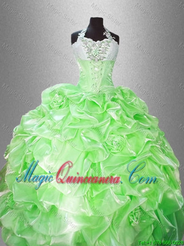 unique exclusive organza dresses for a quinceanera candyland, Luxurious Halter Top Pick Ups Quinceanera Gowns in Spring Green
