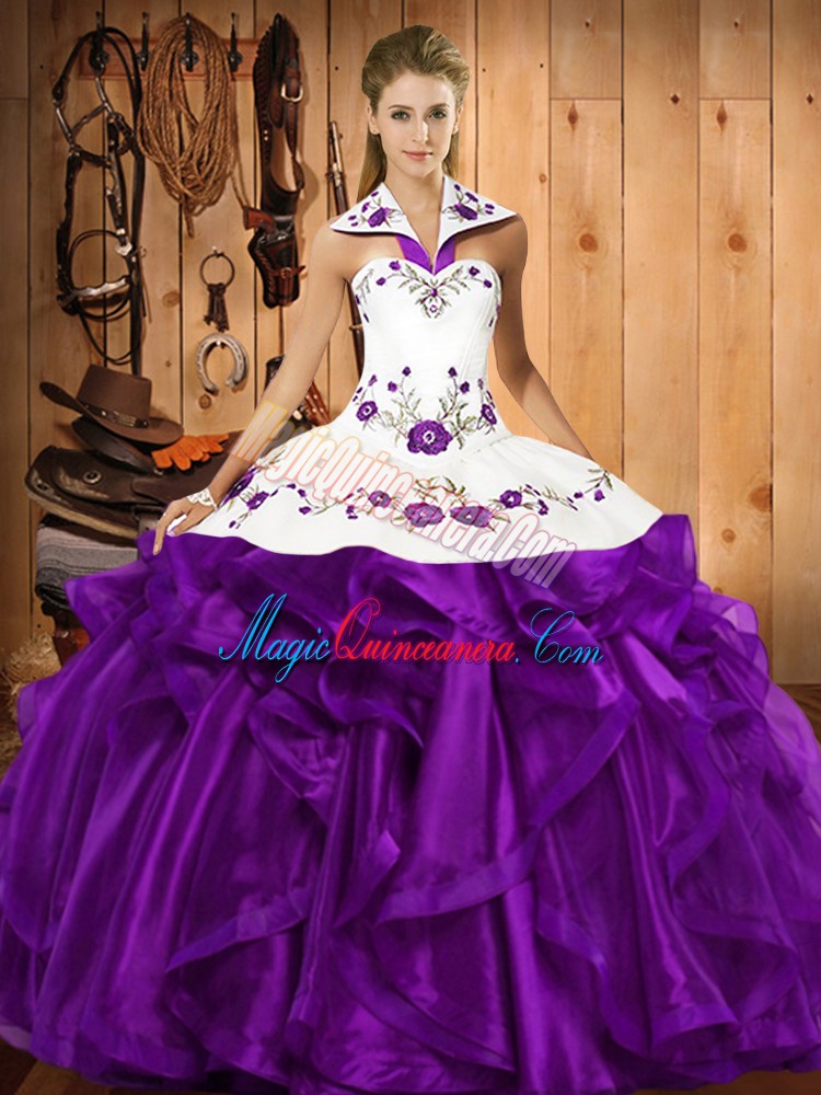 Luxurious Halter Top Sleeveless Lace Up Vestidos de Quinceanera Purple Organza