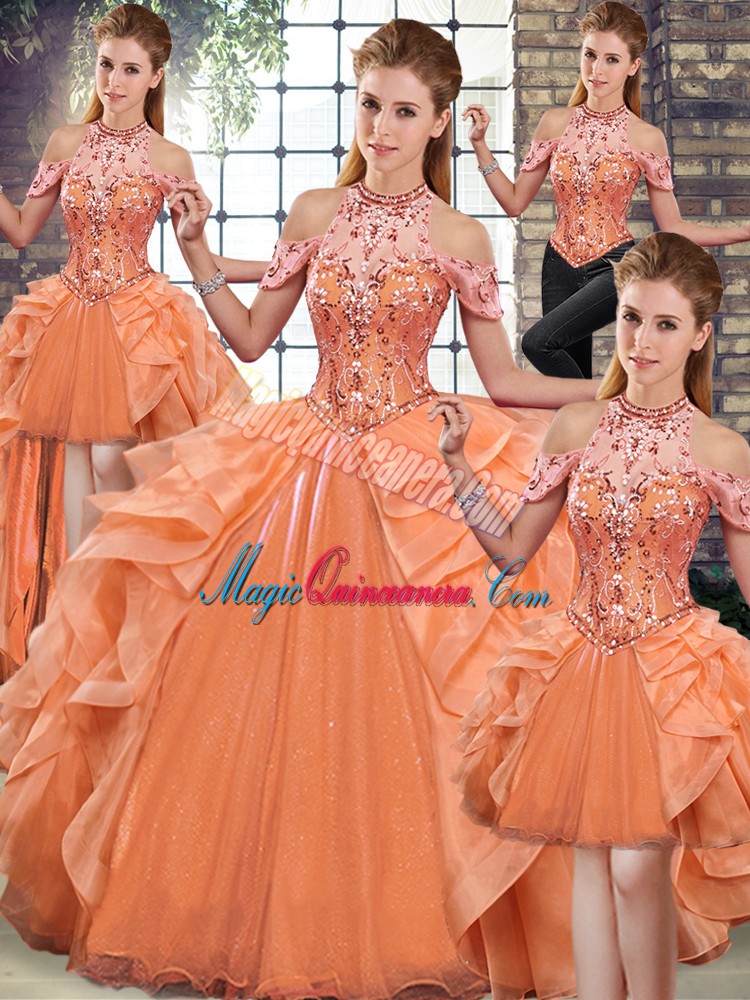Luxurious Orange Ball Gowns Organza Halter Top Sleeveless Beading and Ruffles Floor Length Lace Up Quinceanera Dress