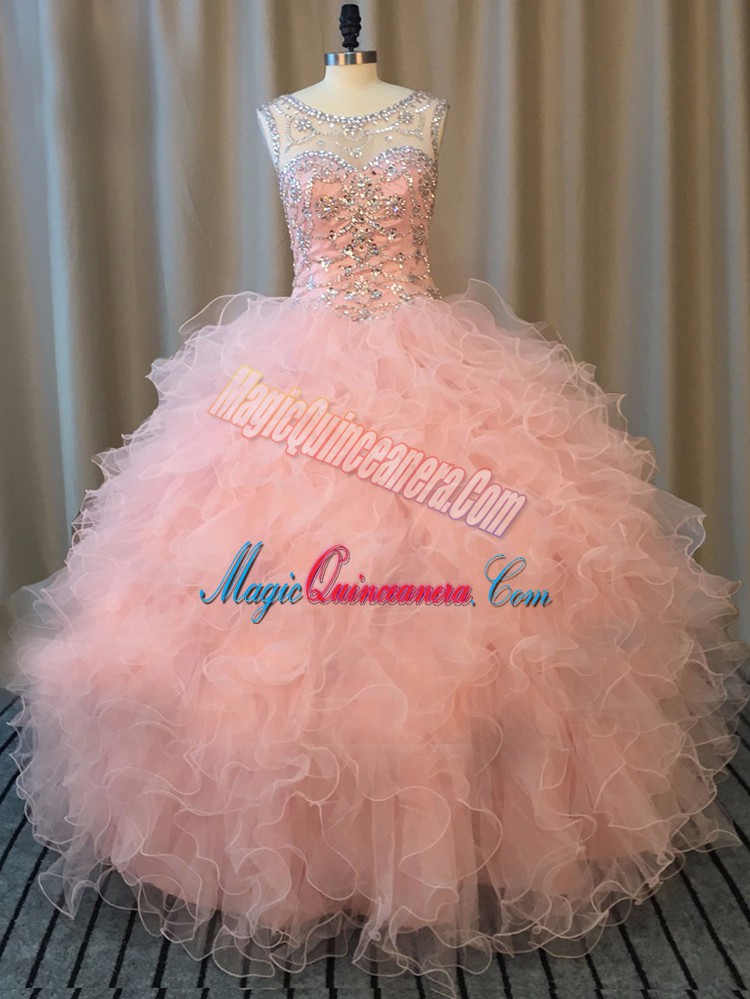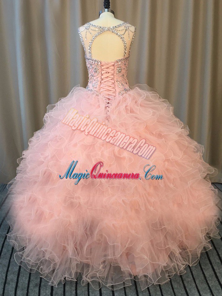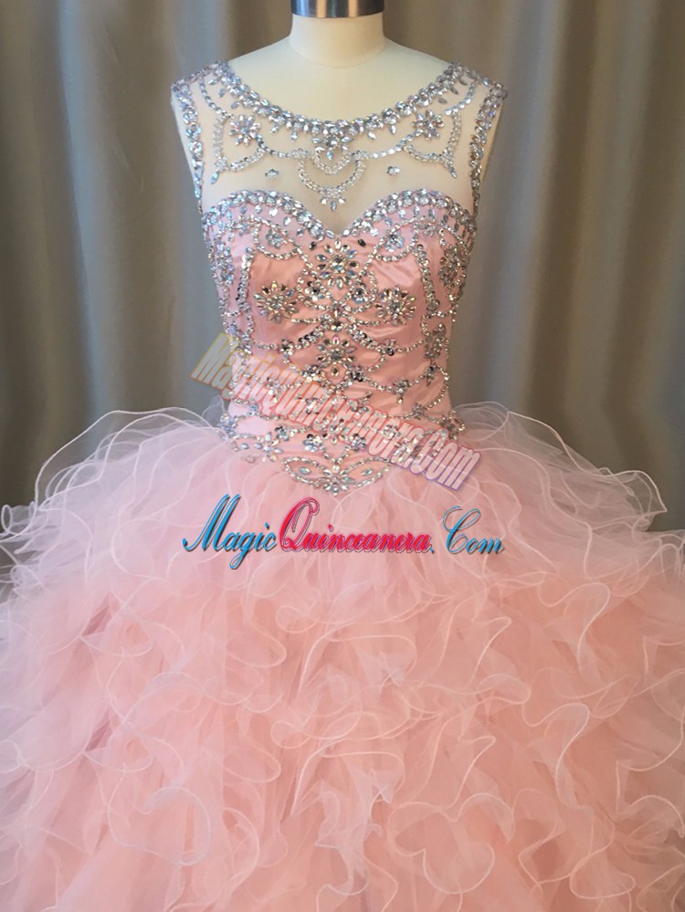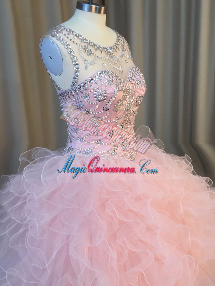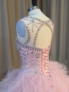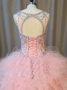 Luxurious Pink Tulle Lace Up Scoop Sleeveless Floor Length Quinceanera Gown Beading and Ruffles
