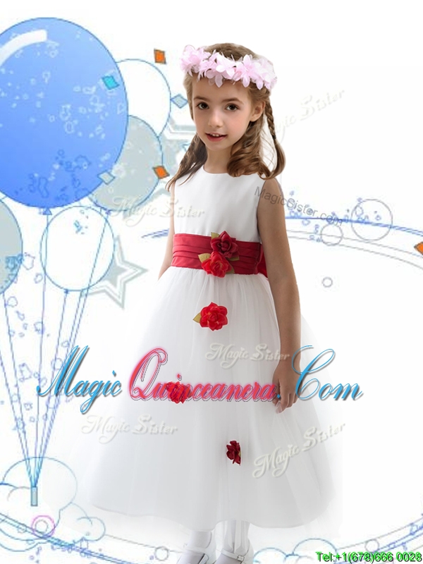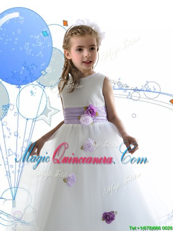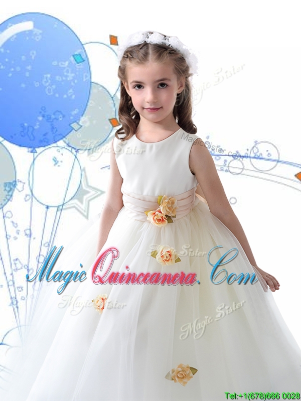 Luxurious Scoop White Flower Girl Dress with Sashes and Hand Made Flowers