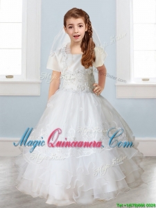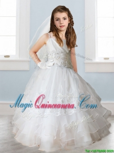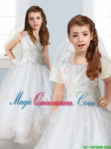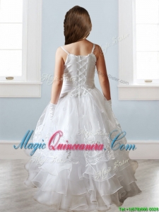 Luxurious White Spaghetti Straps Kid Pageant Dress with Appliques and Ruffled Layers