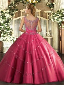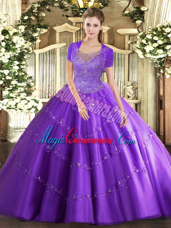Luxury Lavender Clasp Handle Scoop Beading and Appliques Quince Ball Gowns Tulle Sleeveless