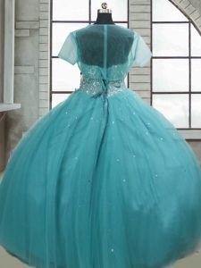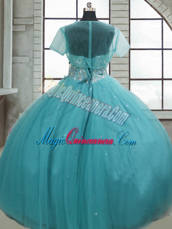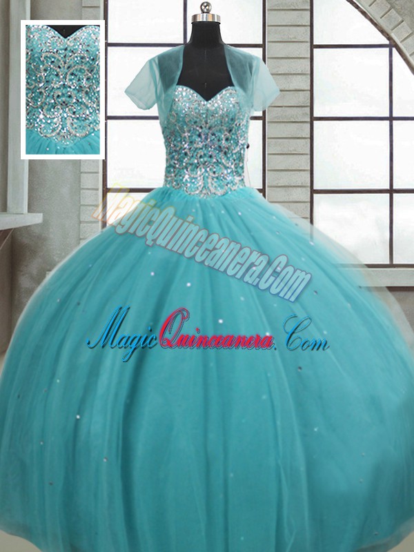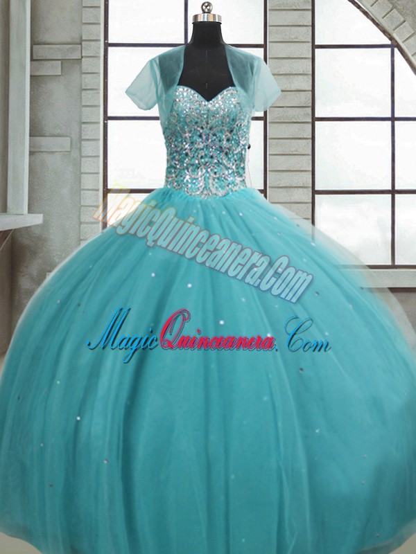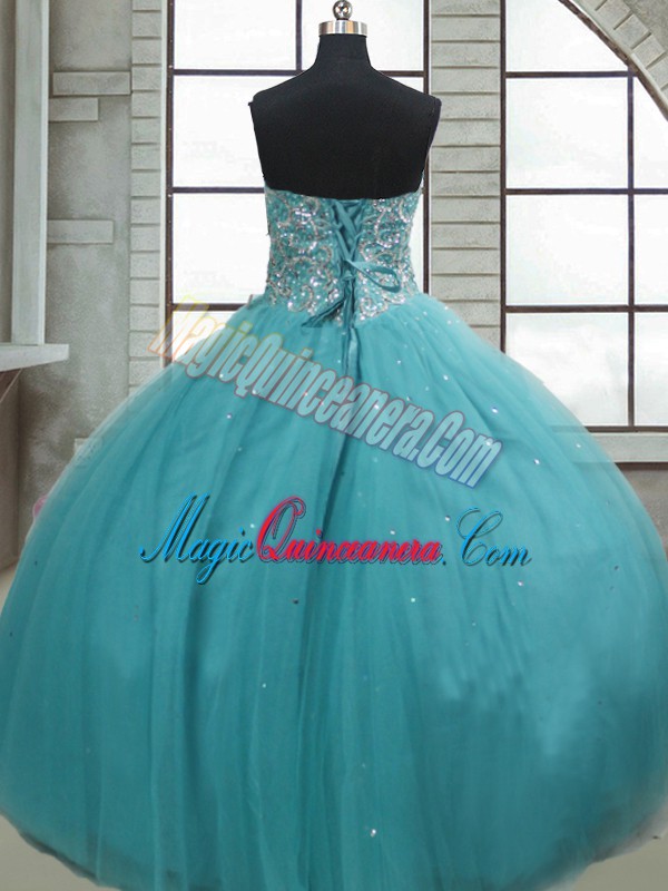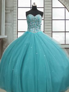 Luxury Tulle Sweetheart Sleeveless Lace Up Beading and Sequins 15th Birthday Dress in Aqua Blue