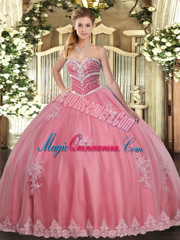 Luxury Watermelon Red Tulle Lace Up Ball Gown Prom Dress Sleeveless Floor Length Beading and Appliques