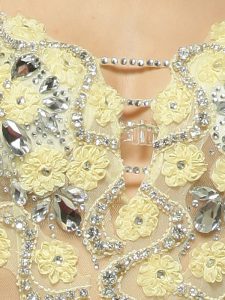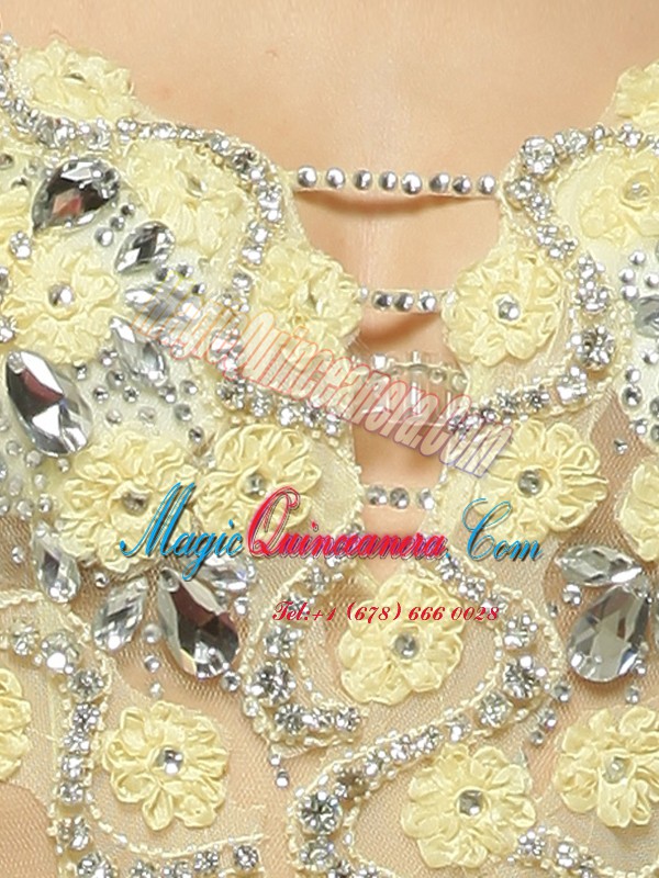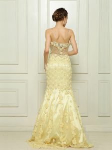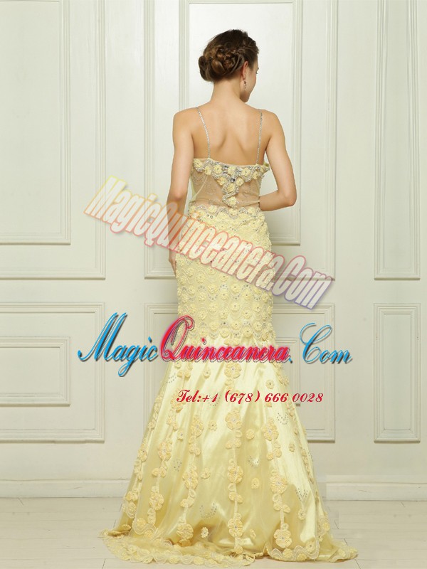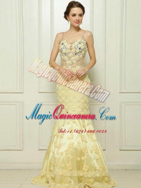 Mermaid Light Yellow Side Zipper Spaghetti Straps Beading and Hand Made Flower Prom Dress Tulle Sleeveless Brush Train