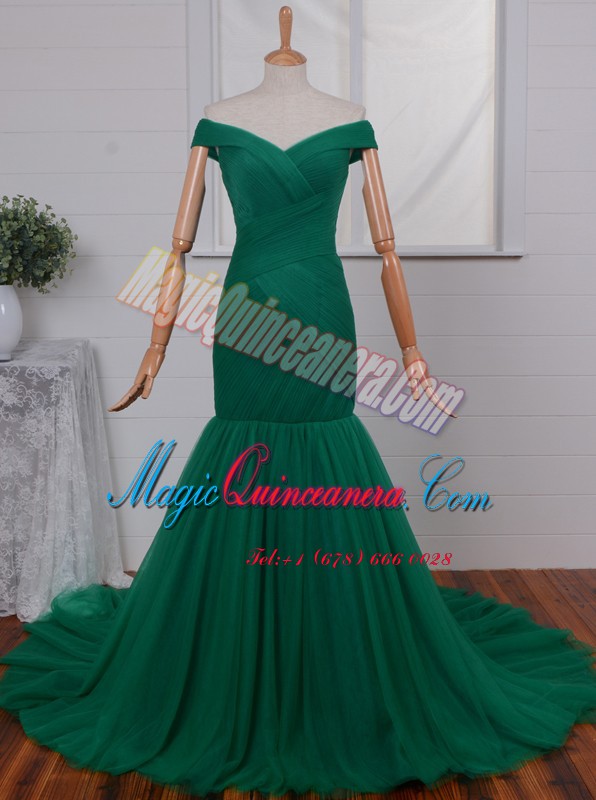 Mermaid Off the Shoulder Sleeveless Ruching Zipper with Green Court Train