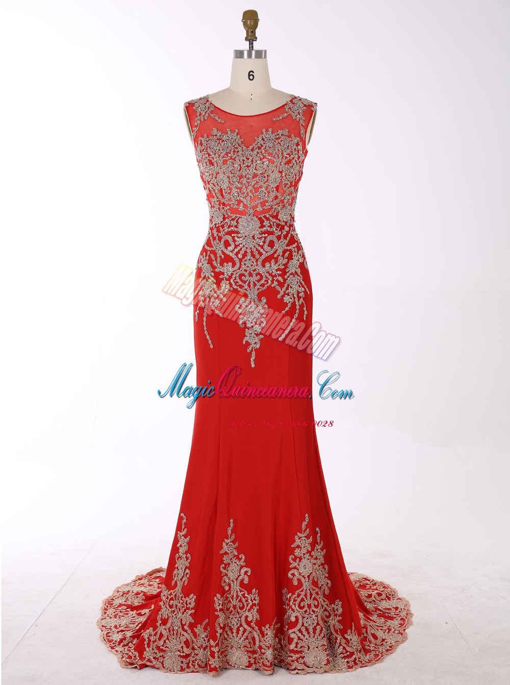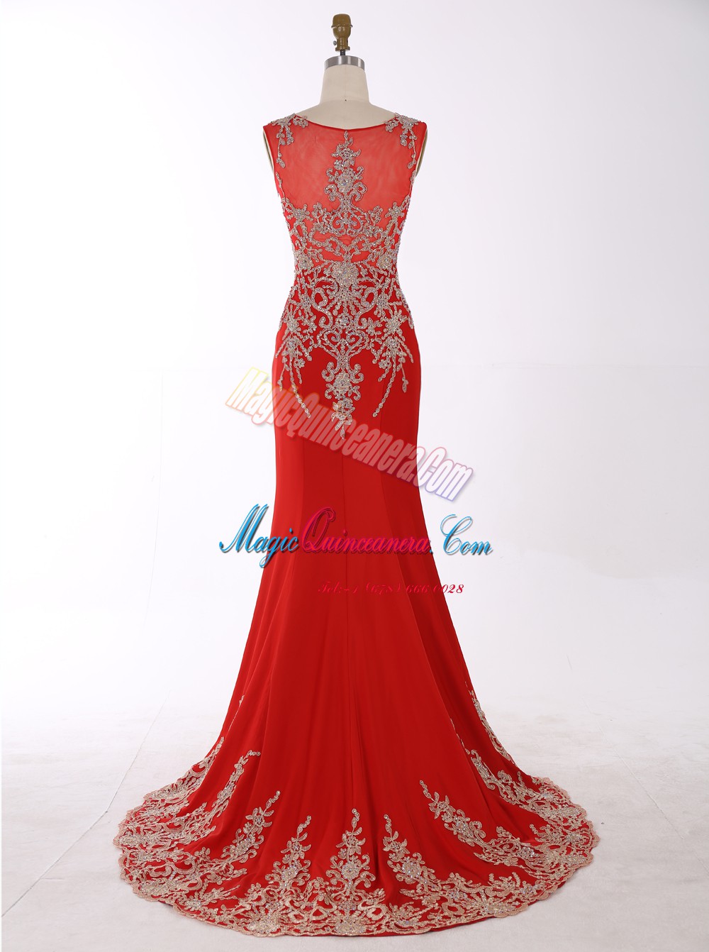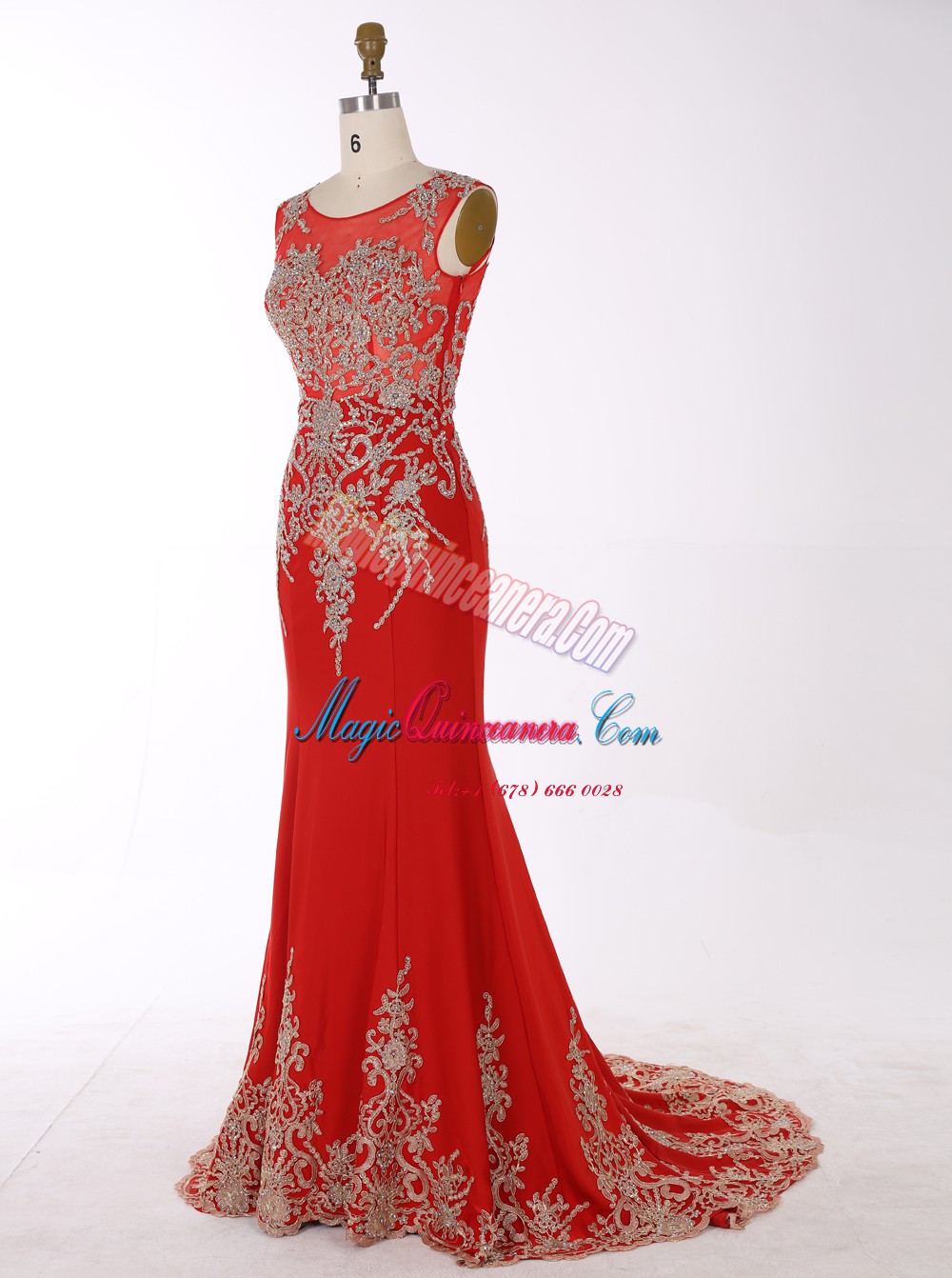 , Mermaid Scoop Sleeveless Brush Train Zipper Prom Party Dress Red Chiffon