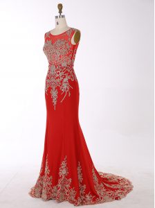 Mermaid Scoop Sleeveless Brush Train Zipper Prom Party Dress Red Chiffon