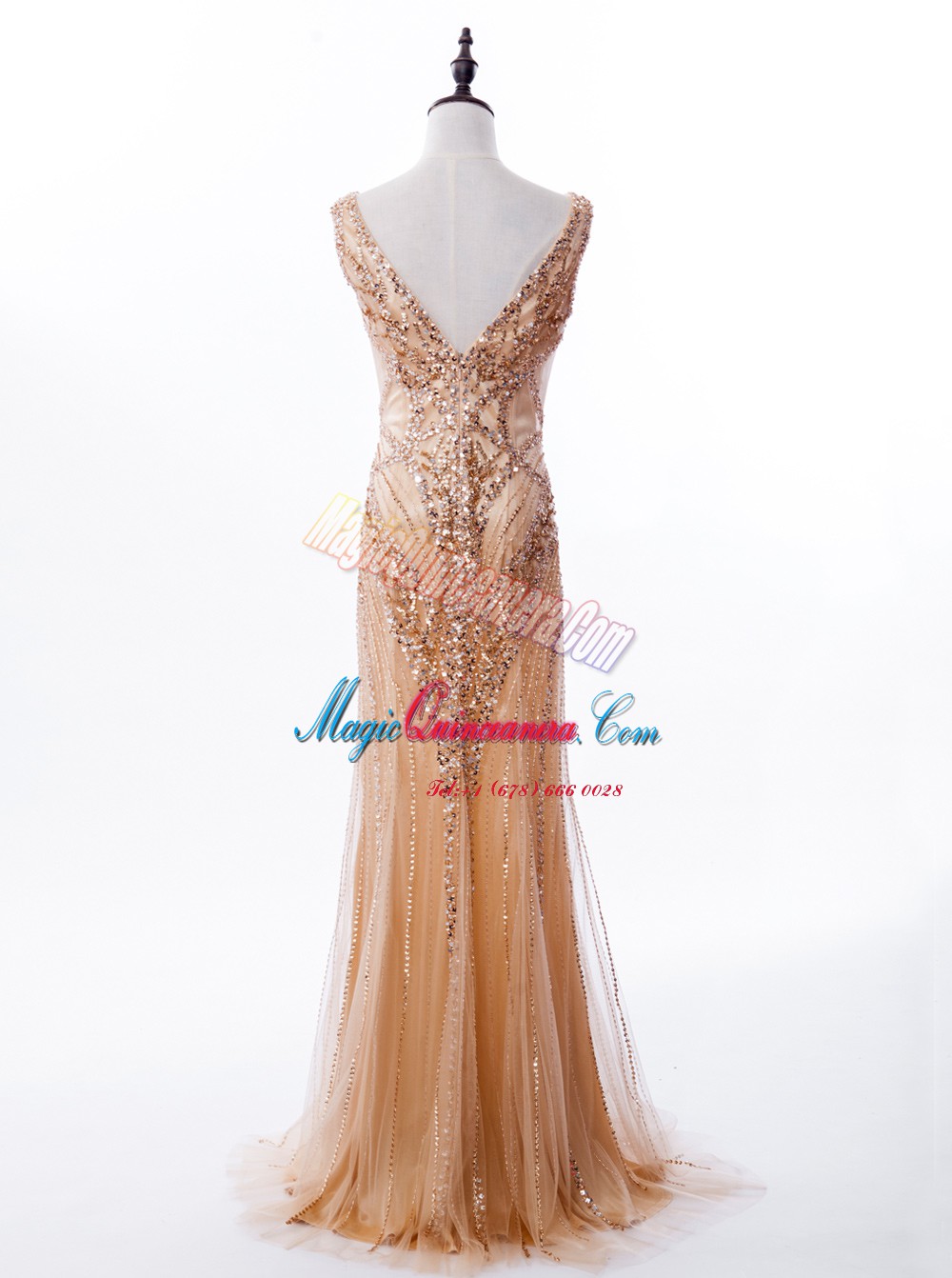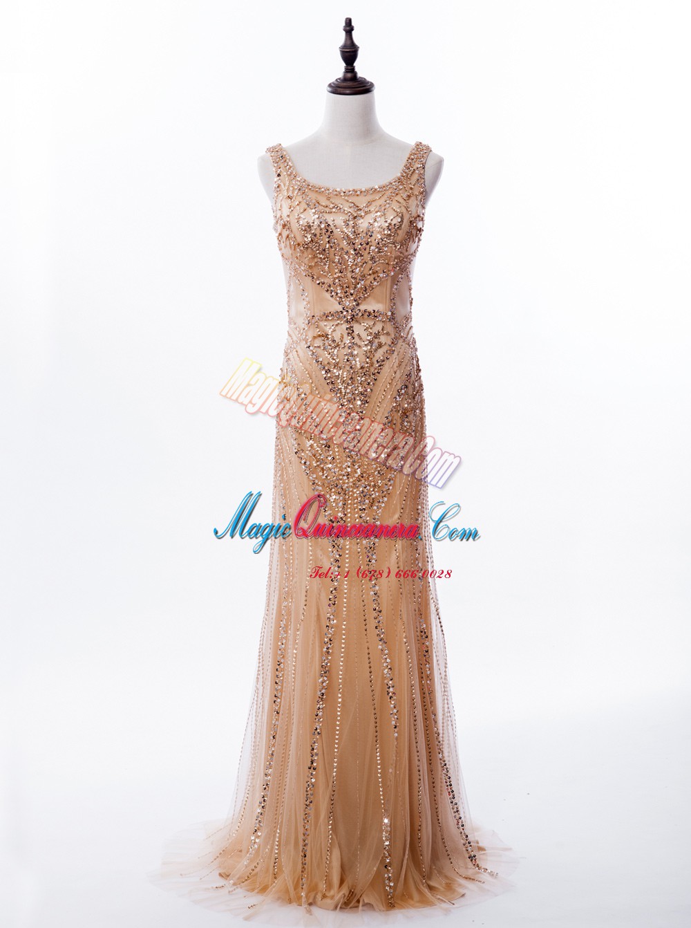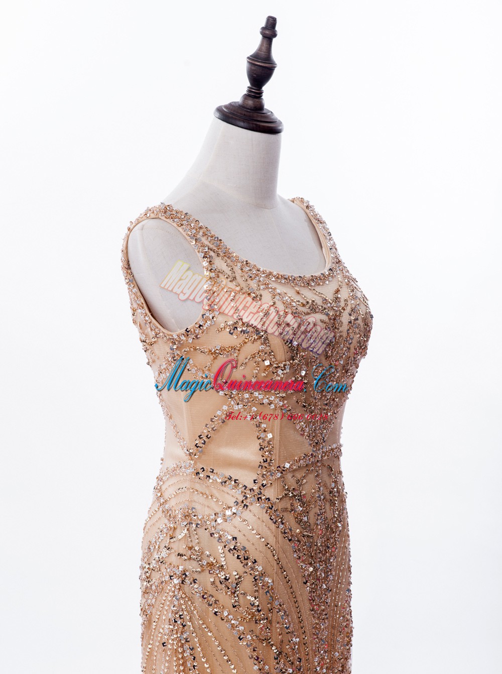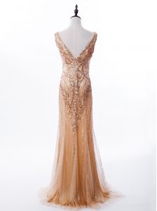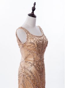Mermaid Square Sleeveless Satin and Tulle Brush Train Zipper Mother Of The Bride Dress in Gold with Beading and Sequins