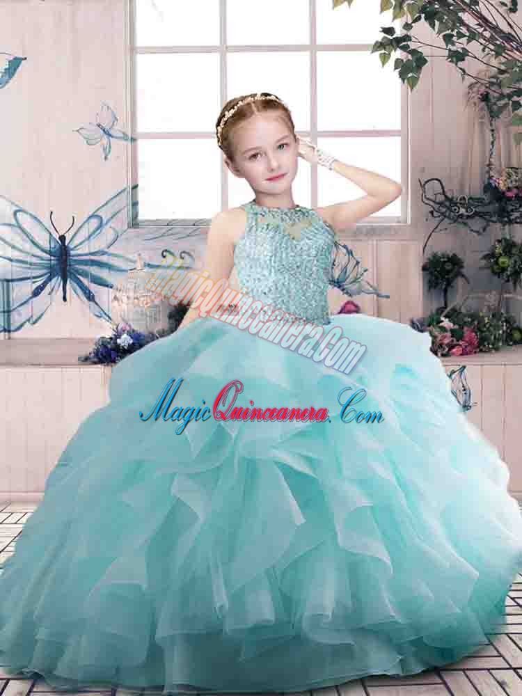 , Modern Aqua Blue Sleeveless Beading and Ruffles Floor Length Kids Formal Wear