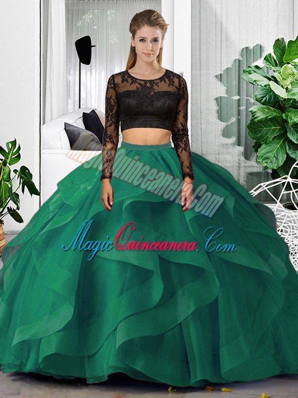 Modern Dark Green Scoop Neckline Lace and Ruffles Sweet 16 Dresses Long Sleeves Backless
