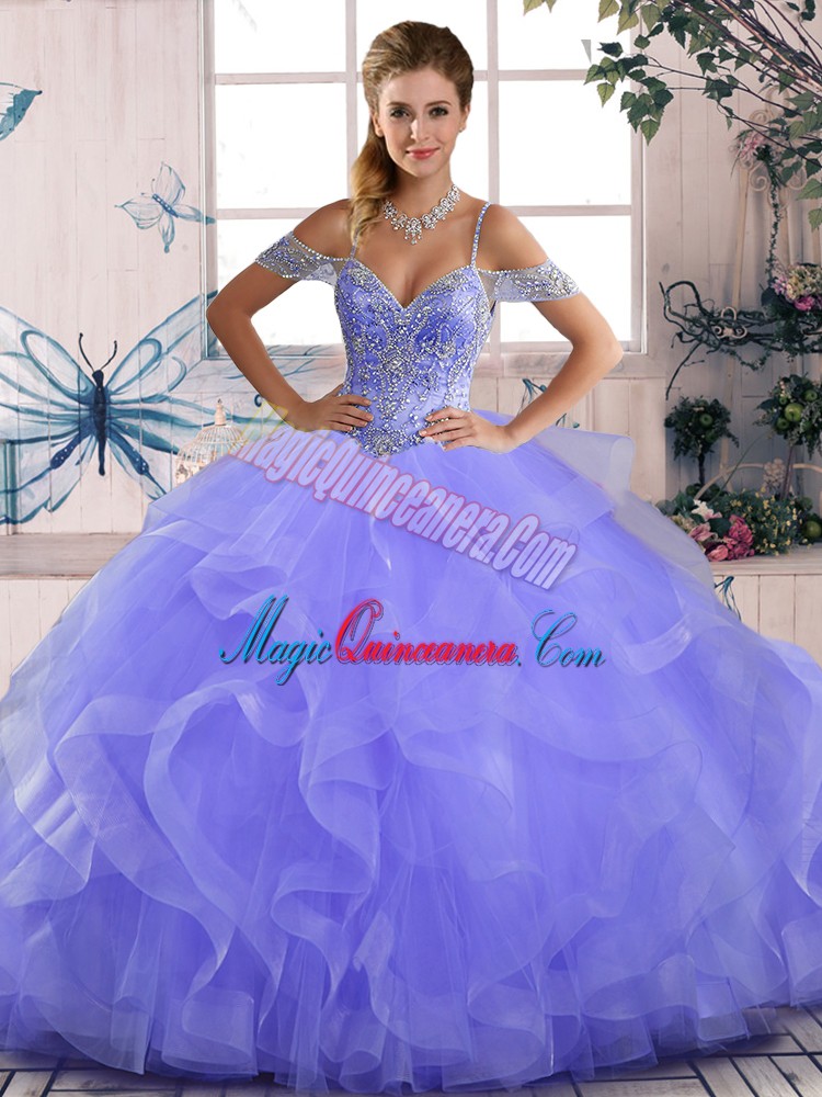 Modern Off The Shoulder Sleeveless Quince Ball Gowns Asymmetrical Beading and Ruffles Lavender Tulle
