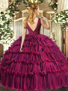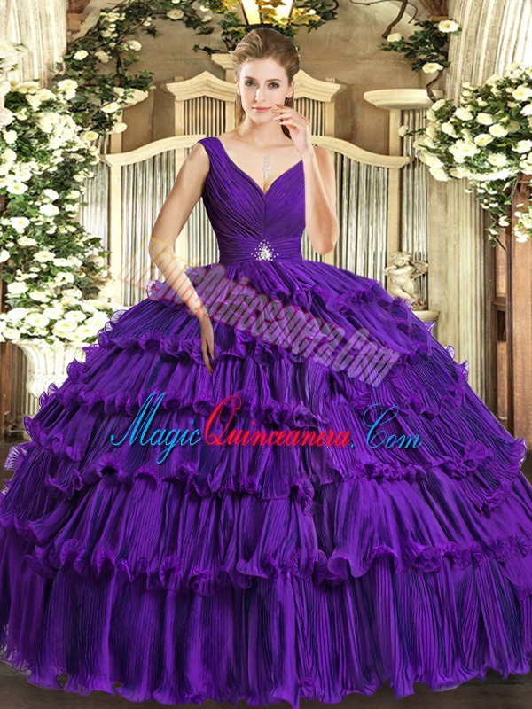 Modern Purple Ball Gowns Organza V-neck Sleeveless Beading and Ruffled Layers Floor Length Backless Ball Gown Prom Dress