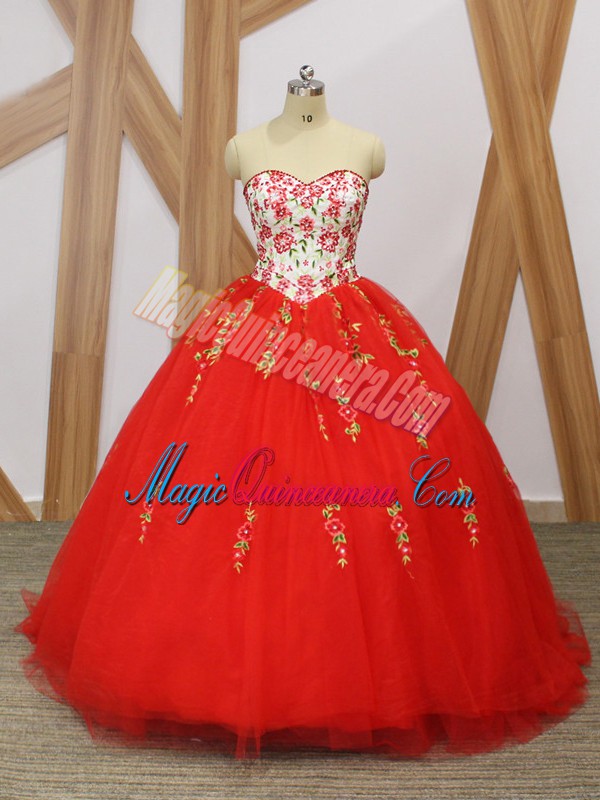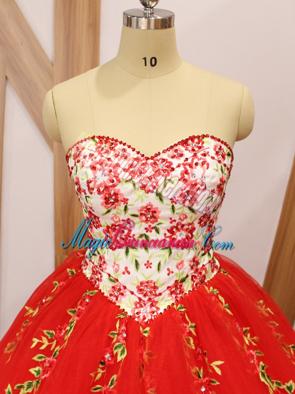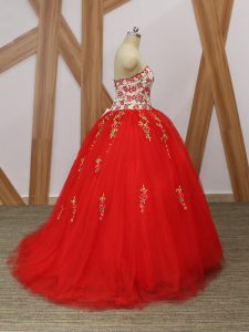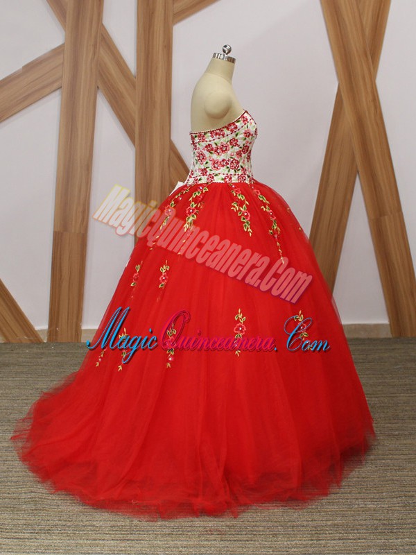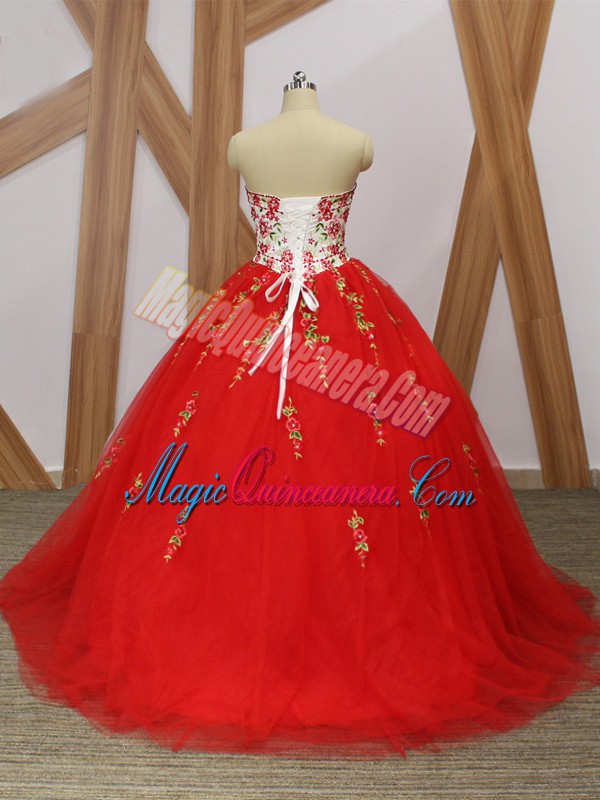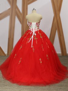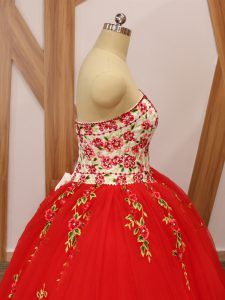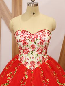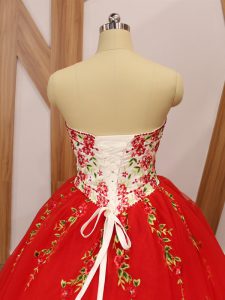 Modern Red Quinceanera Gown Tulle Sweep Train Sleeveless Embroidery and Ruffled Layers