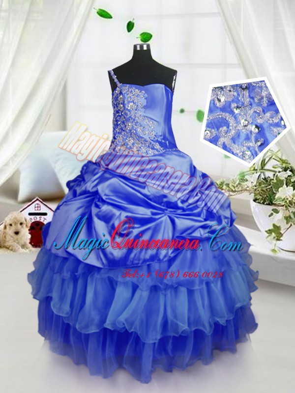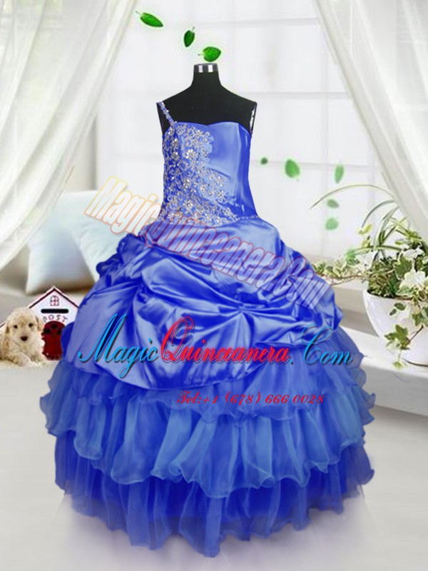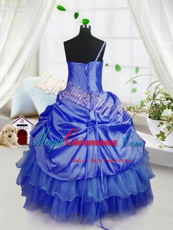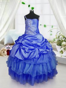 Modern Royal Blue Lace Up Pageant Dress for Teens Beading and Ruffled Layers and Pick Ups Sleeveless Floor Length