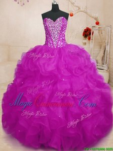 Modest Floor Length Lace Up Quinceanera Dress Fuchsia and In for Military Ball and Sweet 16 and Quinceanera with Beading and Ruffles