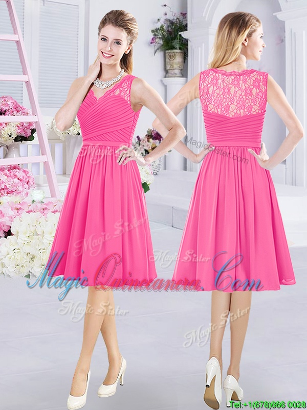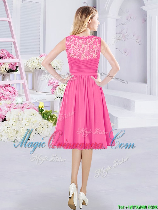 , Modest Hot Pink Sleeveless Knee Length Lace and Ruching Side Zipper Damas Dress