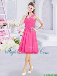 Modest Hot Pink Sleeveless Knee Length Lace and Ruching Side Zipper Damas Dress