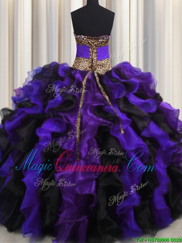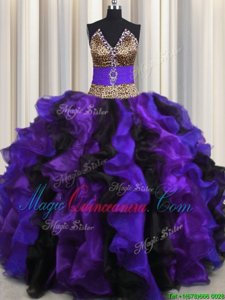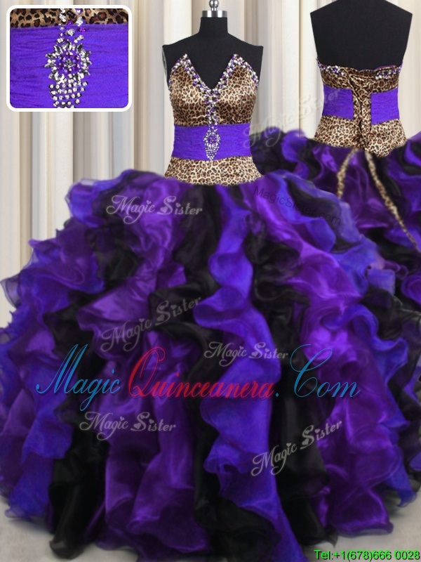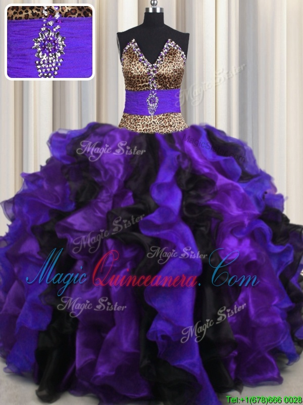 Modest Leopard V Neck Multi-color Ball Gowns Beading and Ruffles 15 Quinceanera Dress Lace Up Organza Sleeveless Floor Length