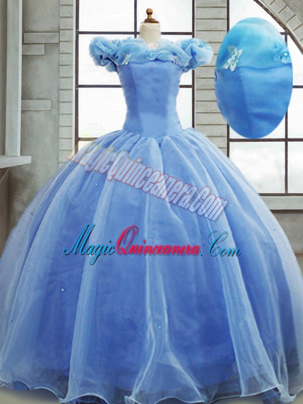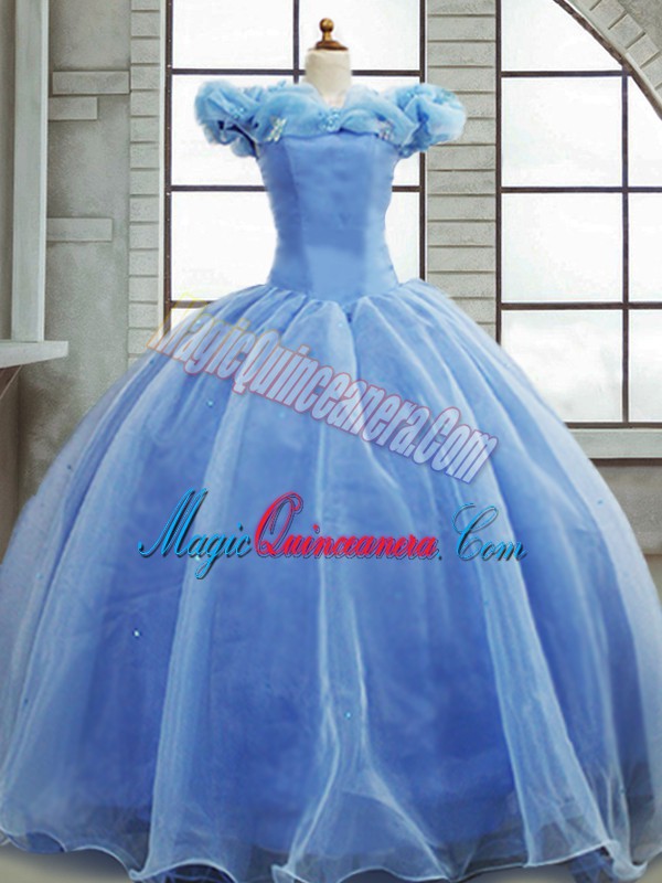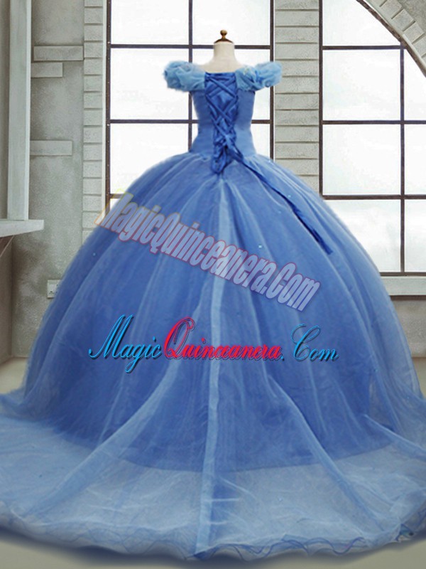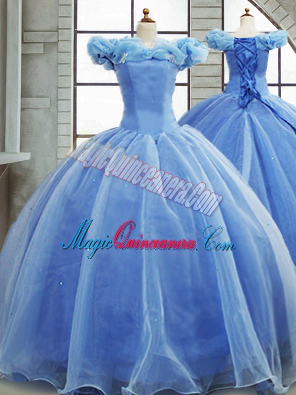 Modest Light Blue Lace Up Off The Shoulder Pick Ups Quinceanera Gowns Organza Sleeveless Brush Train