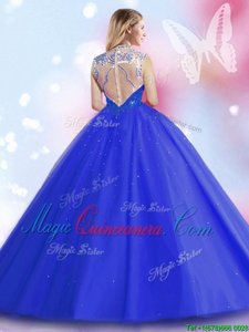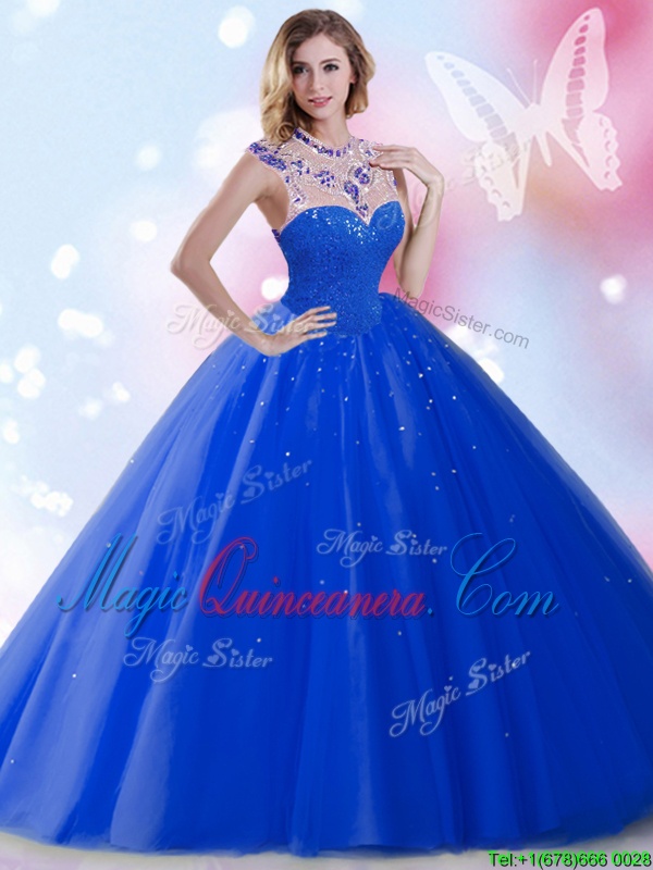 Modest Royal Blue Ball Gowns Tulle High-neck Sleeveless Beading and Sequins Floor Length Zipper Quinceanera Dress