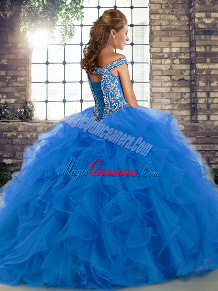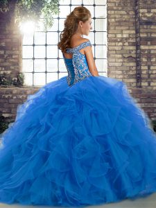 Modest Sleeveless Beading and Ruffles Lace Up Sweet 16 Dress with Turquoise Brush Train
