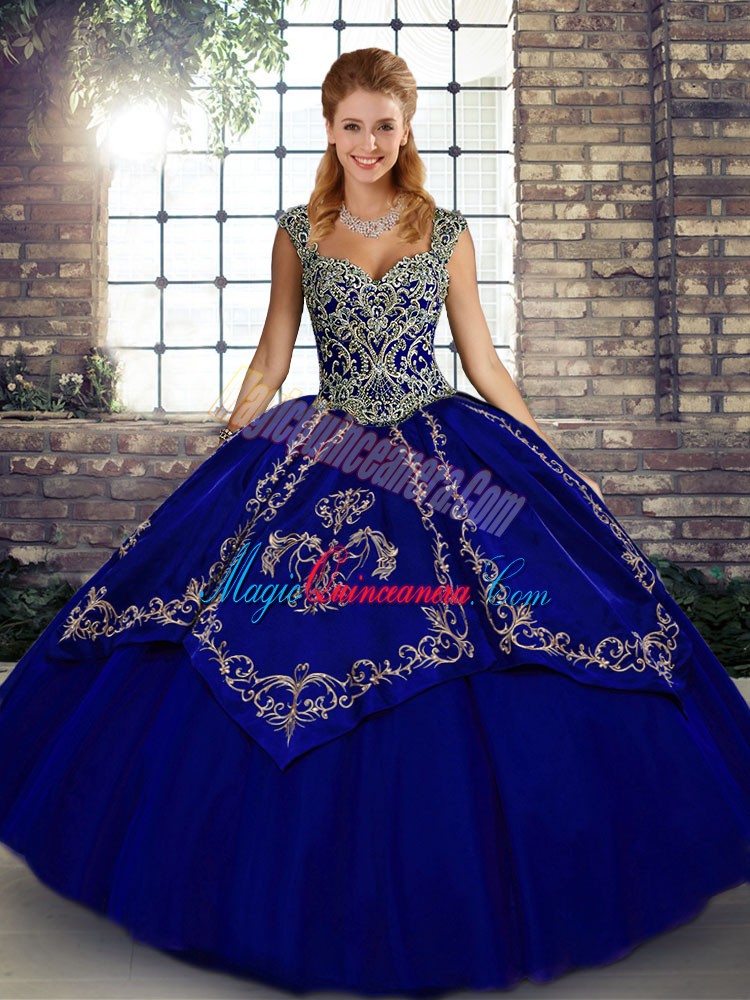 Modest Straps Sleeveless Vestidos de Quinceanera Floor Length Beading and Embroidery Blue Tulle
