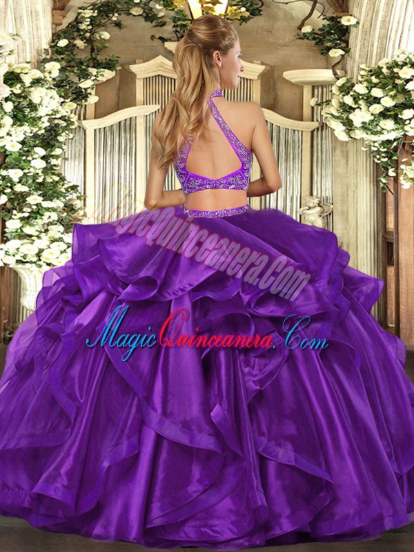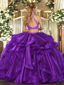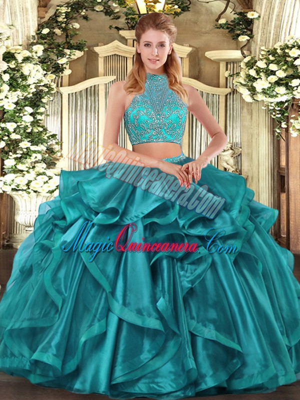 Modest Turquoise Organza Criss Cross Halter Top Sleeveless Asymmetrical Sweet 16 Dress Beading and Ruffled Layers