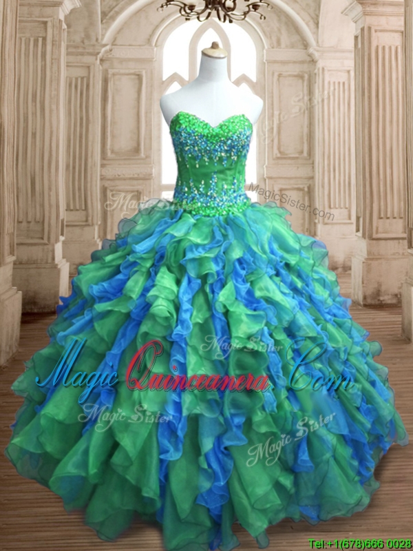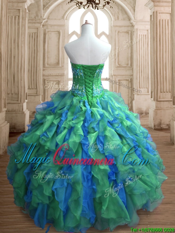 Most Popular Applique and Ruffled Quinceanera Dress in Green and Blue