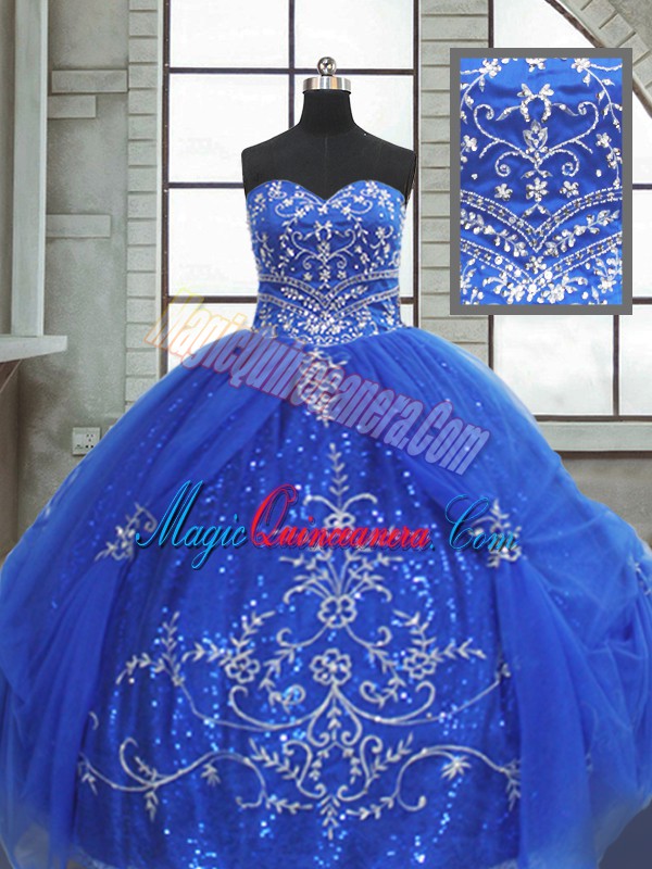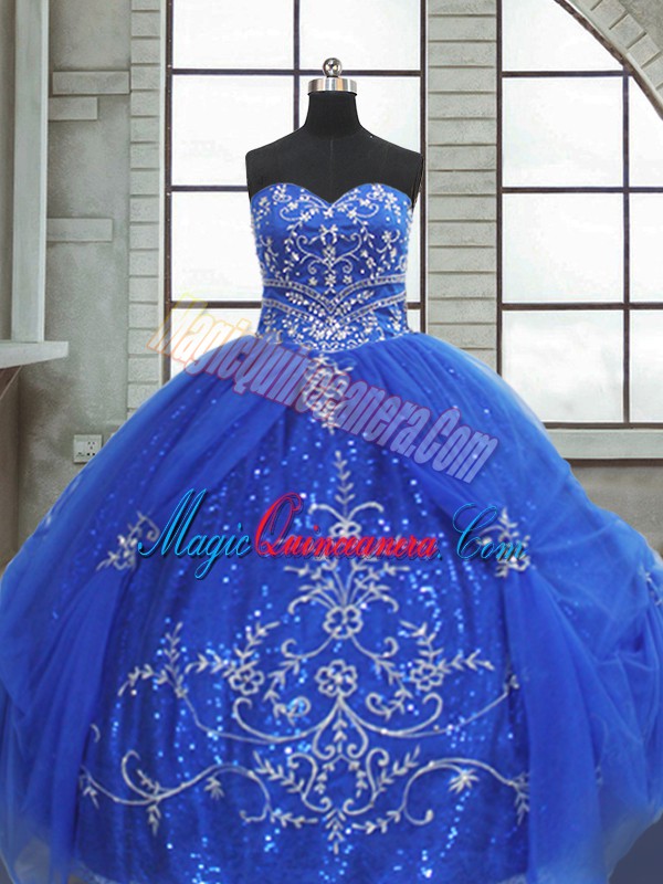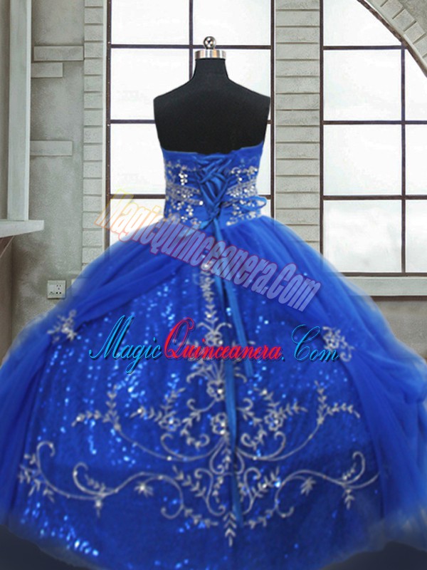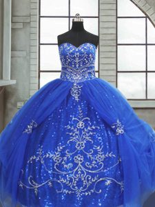 Most Popular Blue Ball Gowns Sweetheart Sleeveless Tulle Floor Length Lace Up Beading and Appliques Quinceanera Dresses