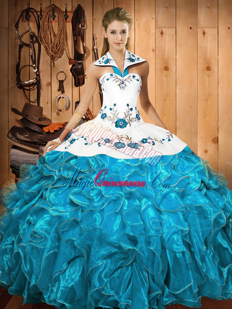 Most Popular Floor Length Lace Up 15th Birthday Dress Baby Blue for Military Ball and Sweet 16 and Quinceanera with Embroidery and Ruffles