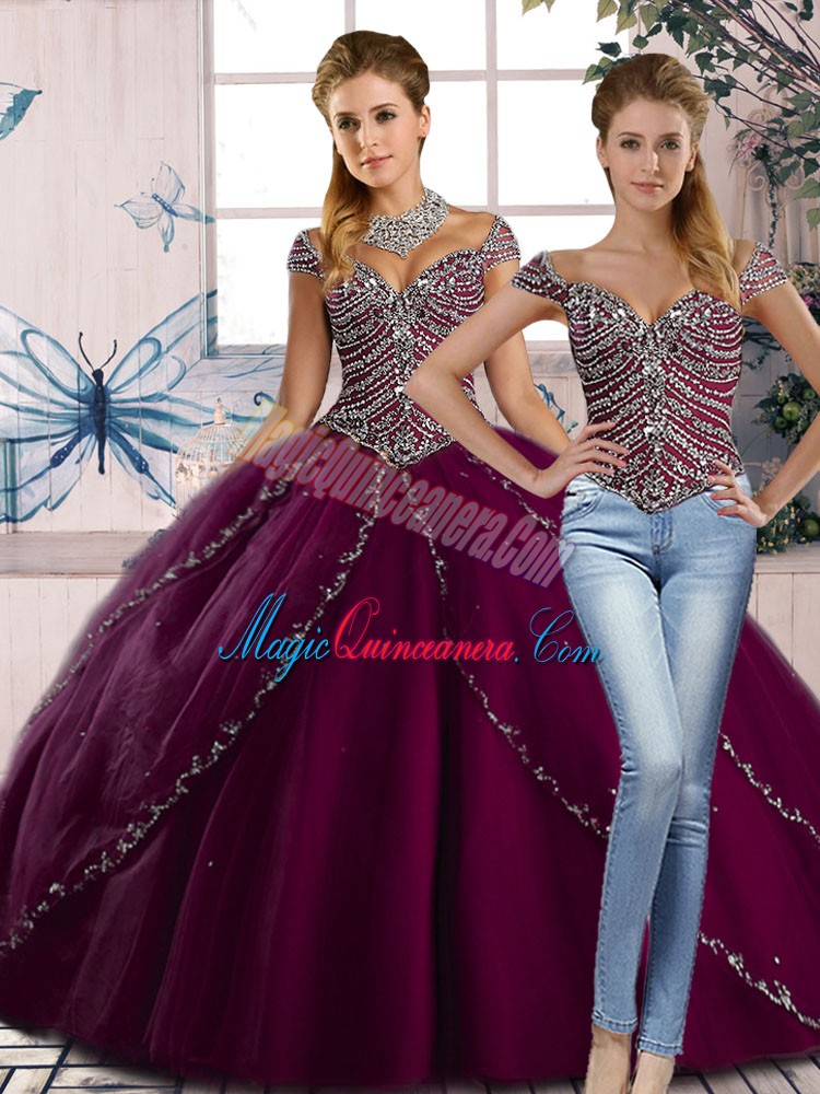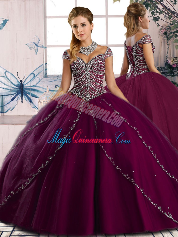 Most Popular Purple Quinceanera Gown Sweet 16 and Quinceanera with Beading Sweetheart Cap Sleeves Brush Train Lace Up