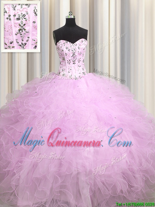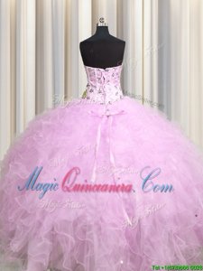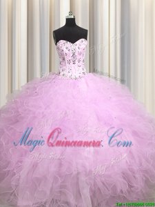 Most Popular Visible Boning Lilac Tulle Lace Up Quinceanera Dress Sleeveless Floor Length Beading and Appliques and Ruffles