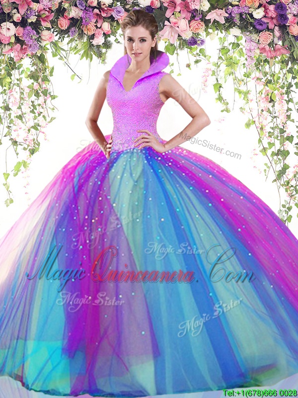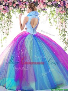 , Multi-color High-neck Backless Beading Quince Ball Gowns Sleeveless