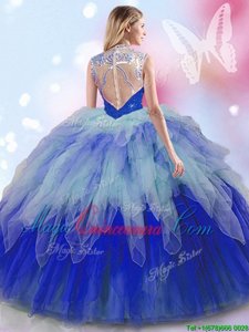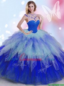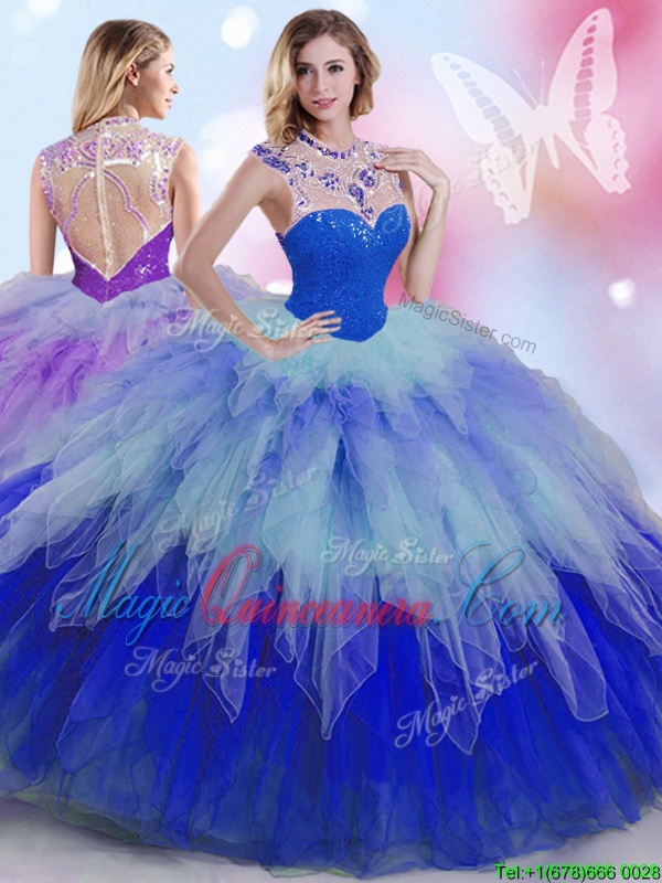 Multi-color High-neck Neckline Beading and Ruffles Sweet 16 Quinceanera Dress Sleeveless Zipper