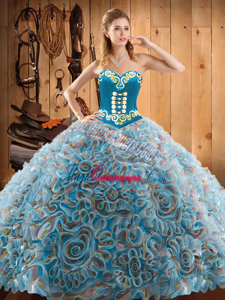 Multi-color Satin and Fabric With Rolling Flowers Lace Up Ball Gown Prom Dress Sleeveless With Train Sweep Train Embroidery