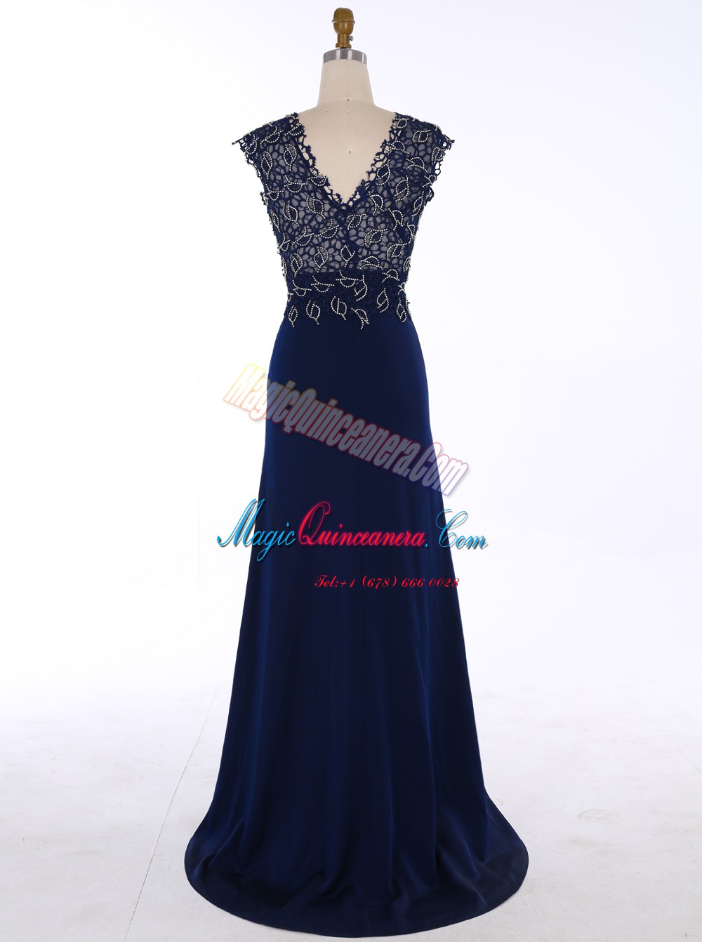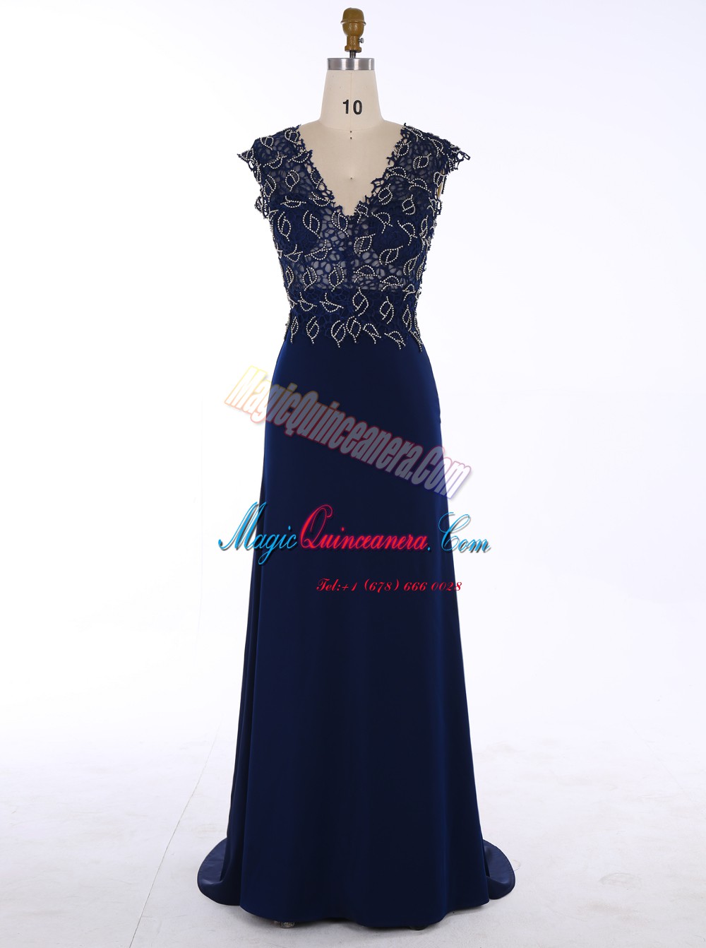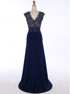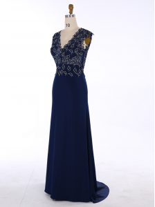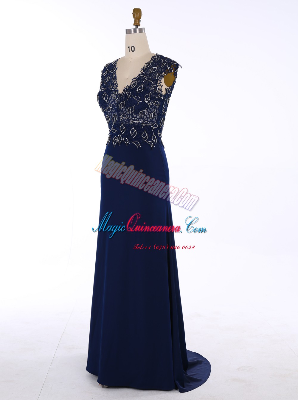 , Navy Blue Chiffon Zipper Prom Evening Gown Sleeveless Sweep Train Appliques