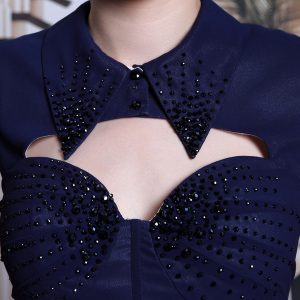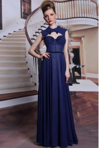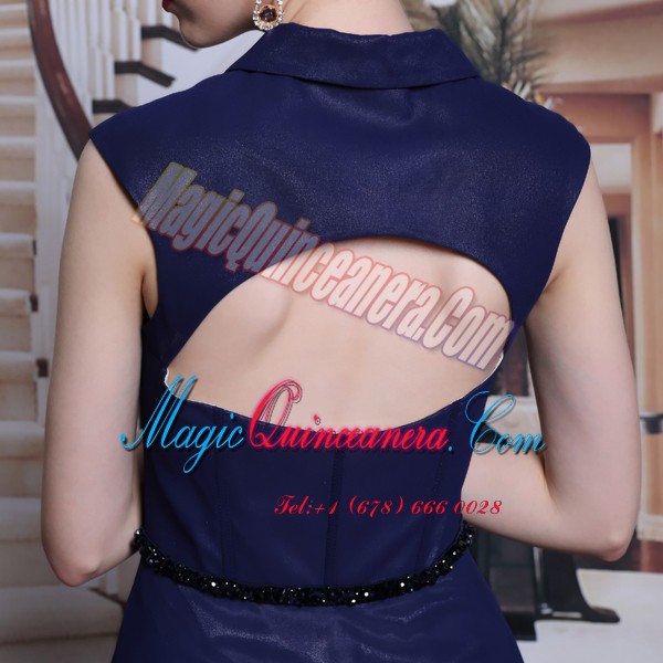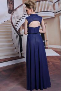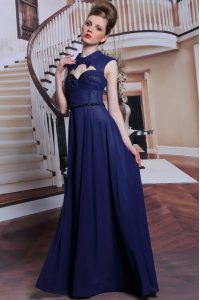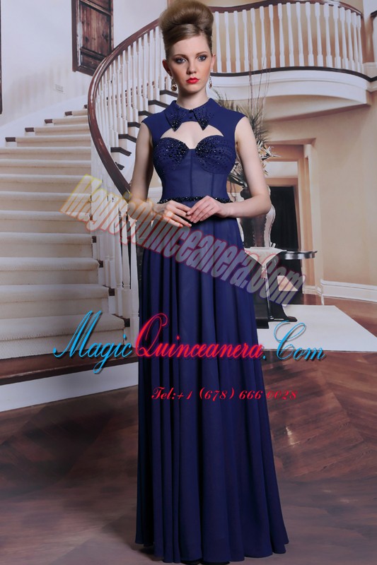 Navy Blue Sleeveless Beading Floor Length Prom Gown