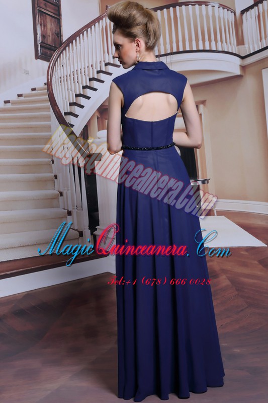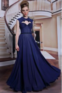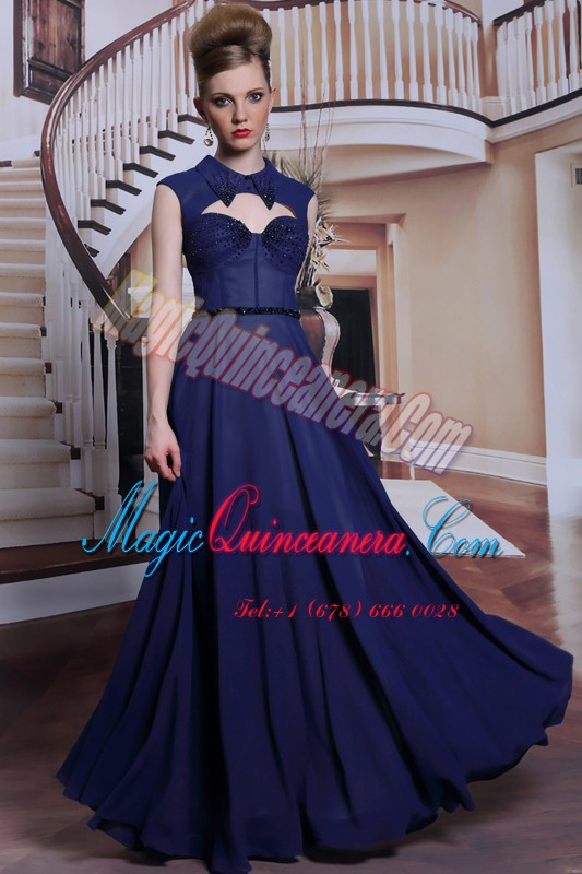 , Navy Blue Sleeveless Beading Floor Length Prom Gown