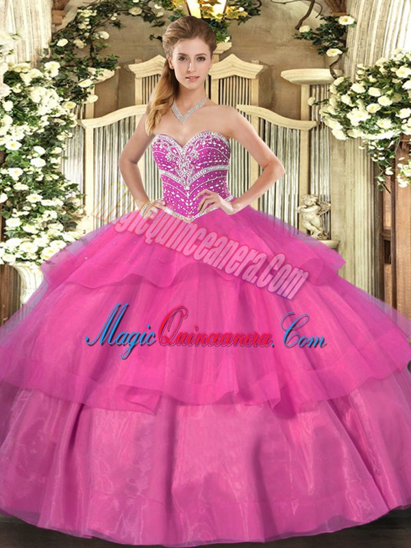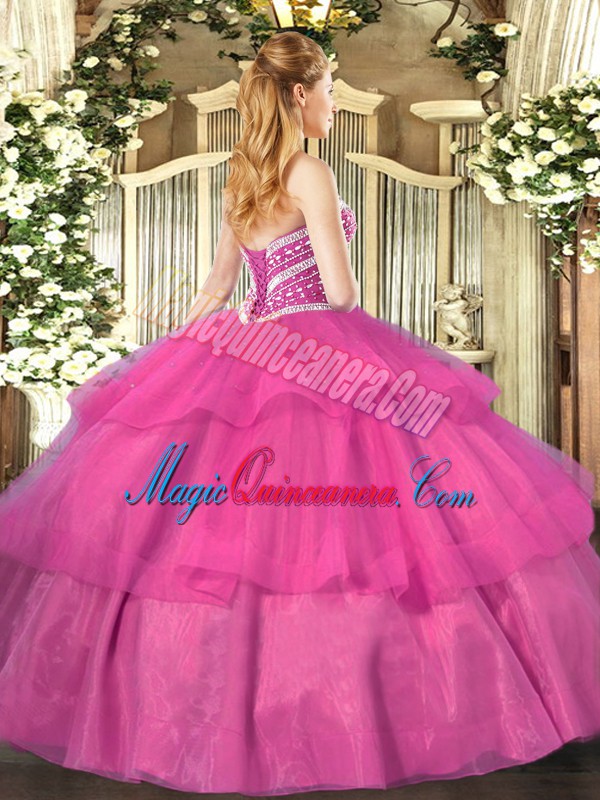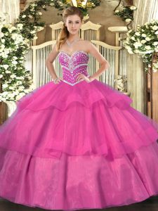 New Arrival Hot Pink Tulle Lace Up Vestidos de Quinceanera Sleeveless Floor Length Beading and Ruffled Layers
