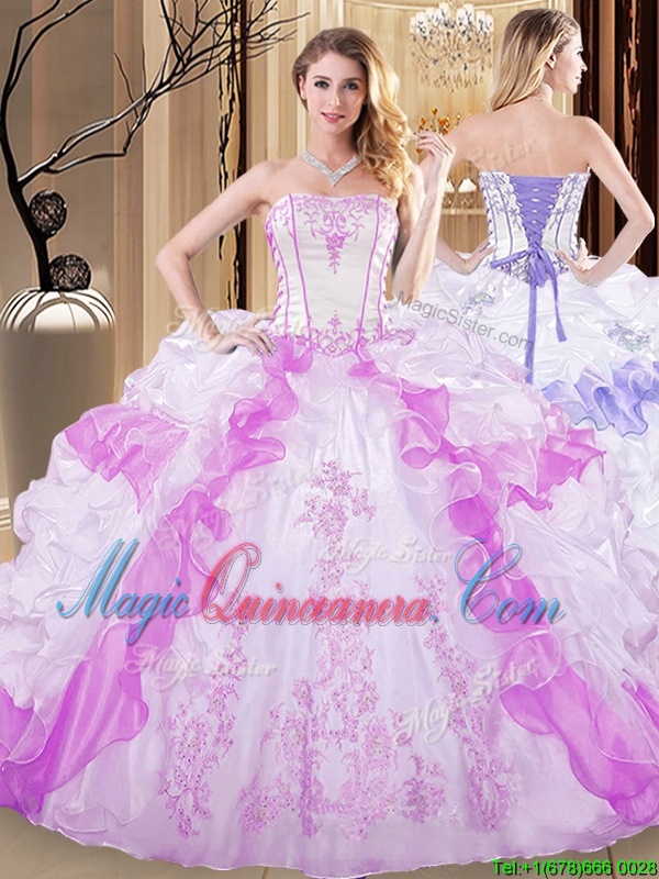 New Arrival Organza Strapless Sleeveless Lace Up Embroidery and Ruffled Layers Quinceanera Gowns in White and Lilac