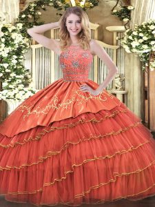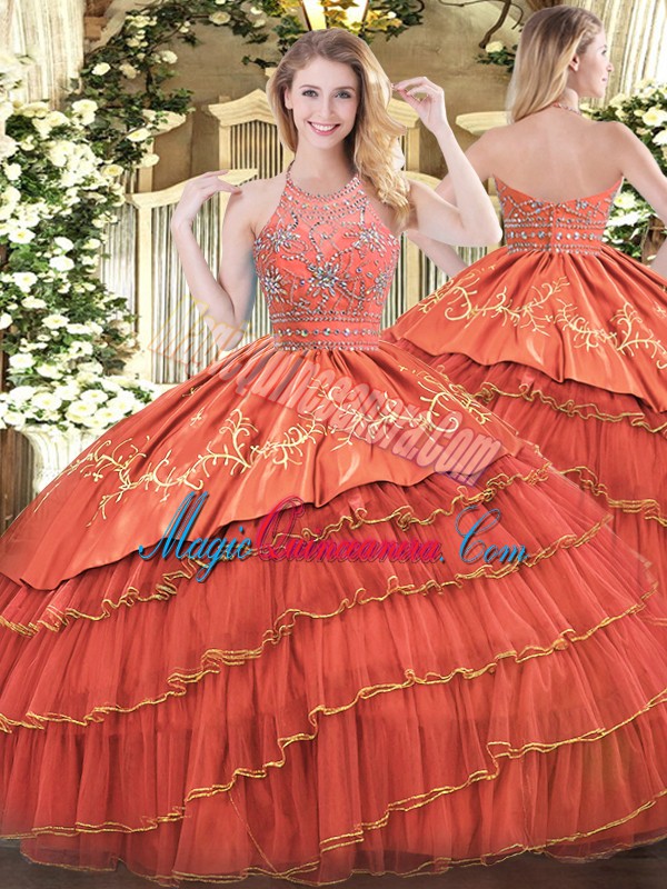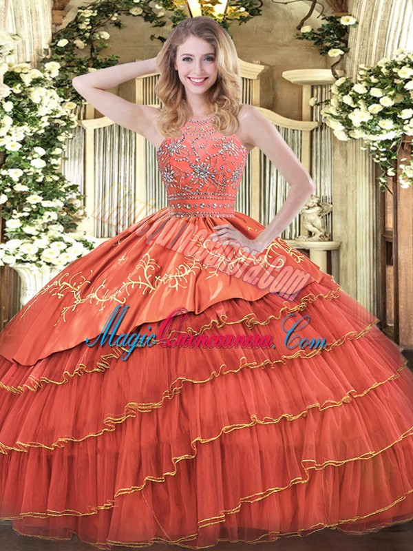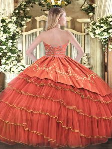 New Arrival Sleeveless Floor Length Beading and Embroidery and Ruffles Zipper Quinceanera Gowns with Rust Red