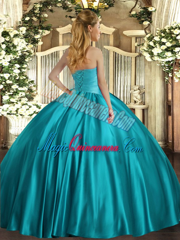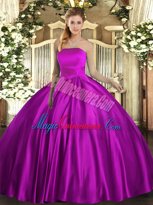 New Arrival Strapless Sleeveless 15th Birthday Dress Floor Length Ruching Fuchsia Satin