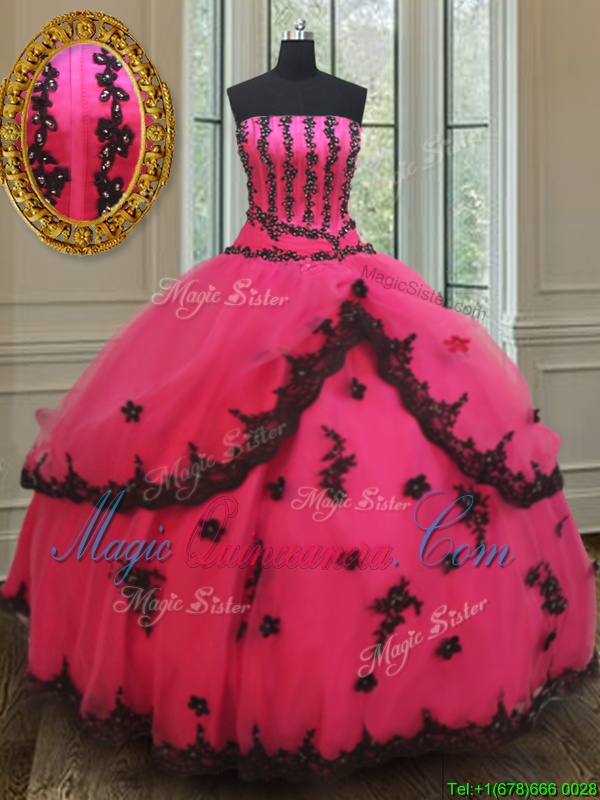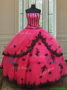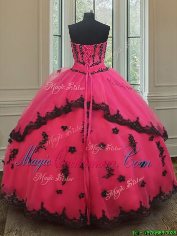 New Arrival Tulle Strapless Sleeveless Lace Up Beading and Appliques Quinceanera Dress in Black and Hot Pink